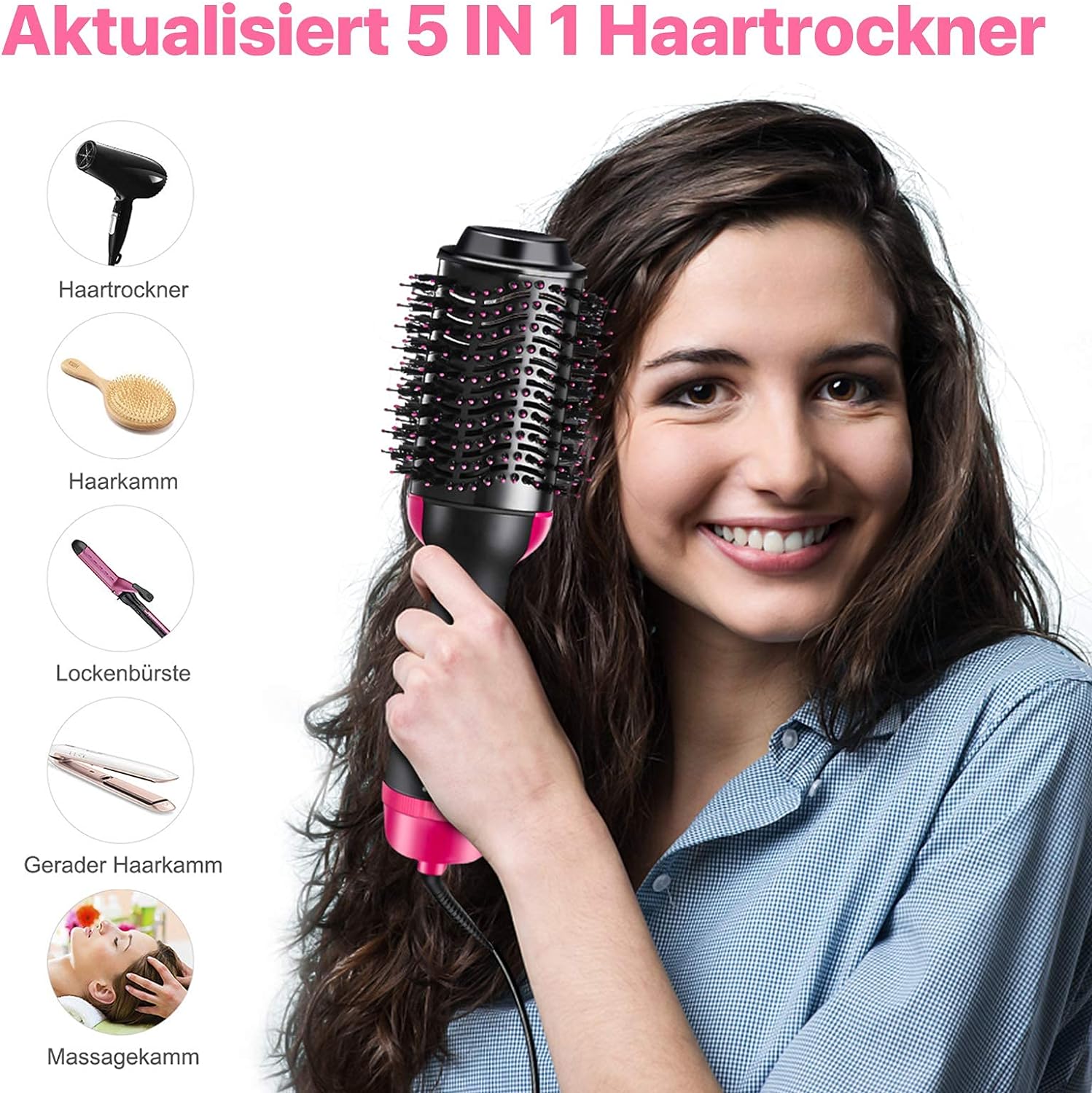 • Secador de pelo 5 en 1: peine de aire caliente todo en uno (secador de pelo, peine de pelo liso, peine de pelo, cepillo de rizado, peine de masaje). Curl cabello liso y seco se puede utilizar libremente para hacer que tu cabello ondulado u ondulado sea suave. Presenta un estilo diferente en poco tiempo, 30% de reducción de ruido.