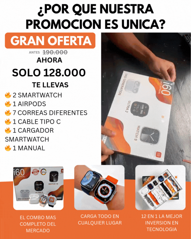 El Combo i60 Suit Extreme es la combinación definitiva para quienes buscan estilo, tecnología y rendimiento. Disfruta de un reloj inteligente potente, audífonos inalámbricos de alta calidad y 7 correas para cambiar tu look todos los días, todo en un solo paquete. Ideal para uso diario, deporte y trabajo.