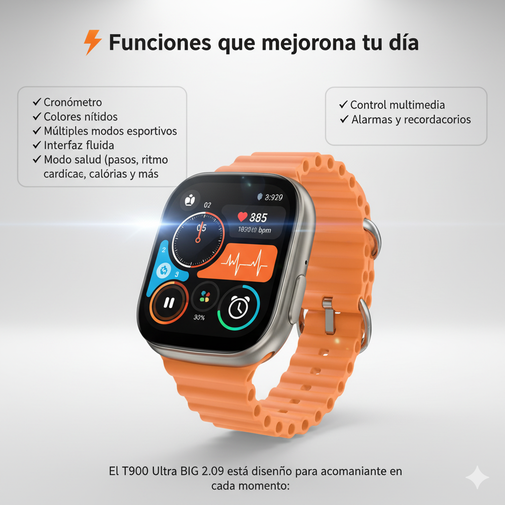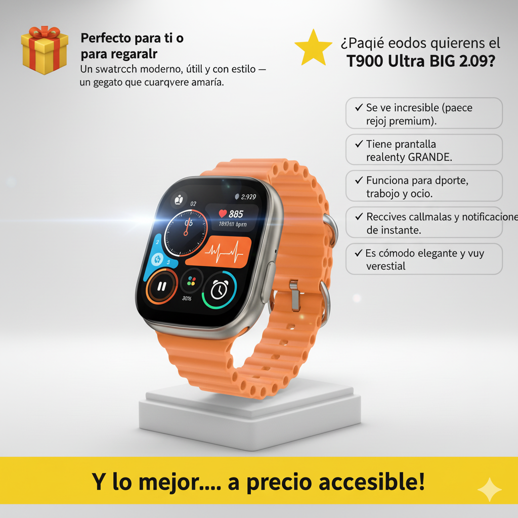 Si buscas un reloj inteligente que realmente marque la diferencia, el T900 Ultra BIG 2.09 es para ti. Un smartwatch con diseño premium, pantalla enorme y funciones avanzadas que elevan tu estilo y mejoran tu día a día.